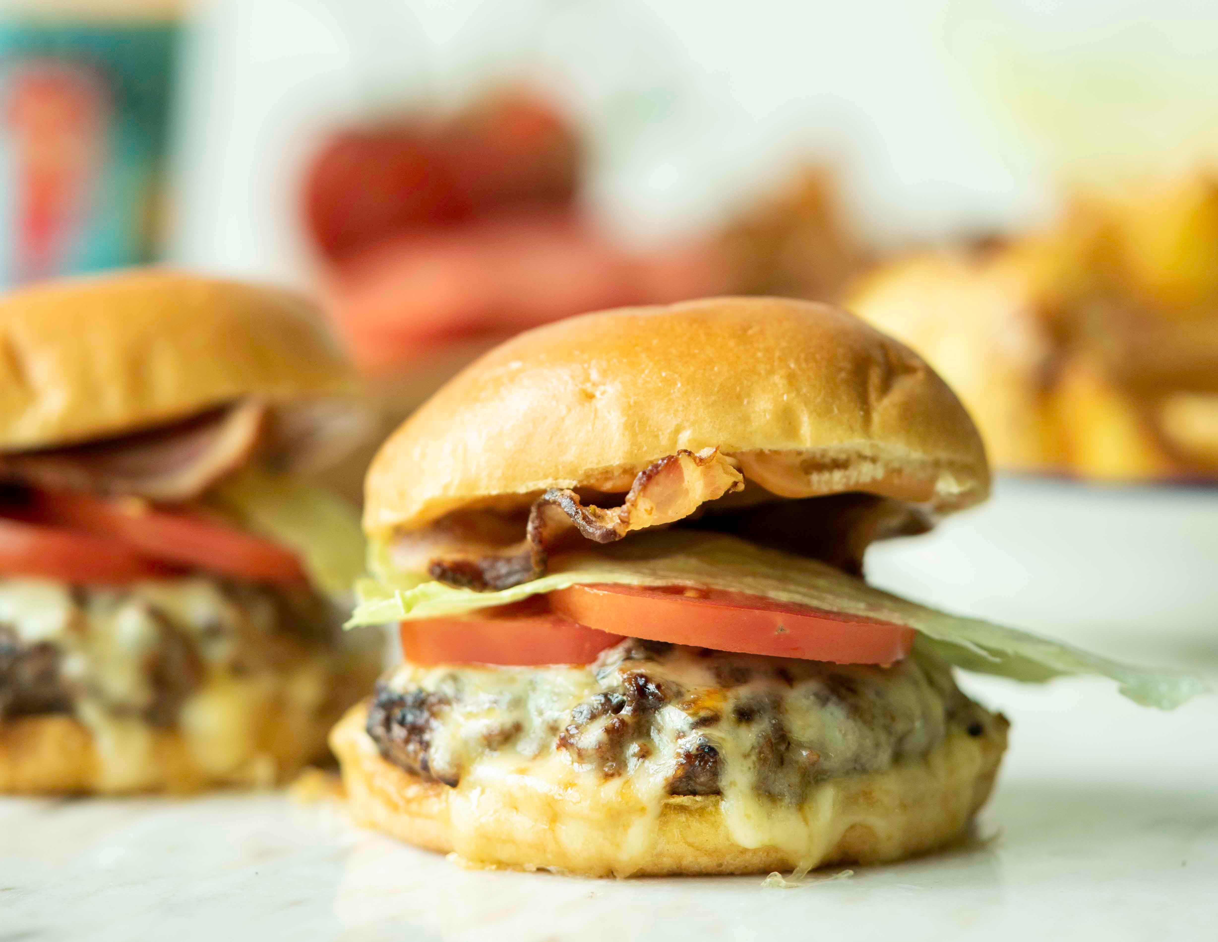 Put the patties onto the bottom half of the brioche buns and top with 2 slices of the cheese. Put under a hot grill and grill until bubbly and golden brown.