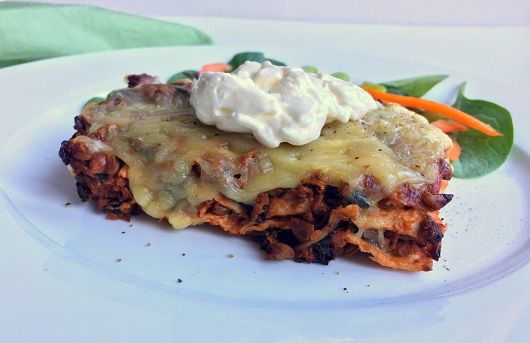 In your oven proof dish, spoon a third of the meat mixture and spread evenly across the base of the dish. Top with two tortillas to overlap. Repeat with the second third of the meat mixture. Top with two tortillas overlapping (or as many as you need depending on the size of your dish). Spoon the final quantity of the meat mixture over top and sprinkle evenly with cheese.