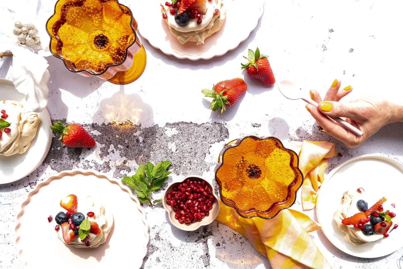 Beat the cream to your liking then stir in the icing sugar and vanilla bean paste. Dollop the cream on top of the meringues, top with the berries and the pomegranate then garnish with the mint.
